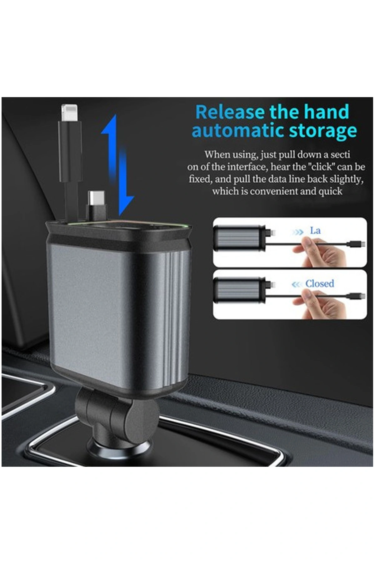 İki adet 80 cm uzunluğunda uzatılabilir kabloya sahip olan bu şarj cihazı, basit depolama çözümleri sunar ve aracınızı düzenli ve organize tutar.