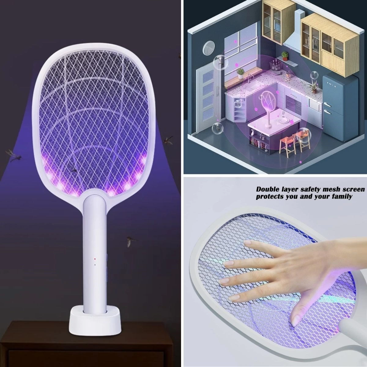 Şarjlı Sinek Öldürücü Masaüstü Standlı, Mor Işık Sinek Kovucu Raket 5W, sinek ve diğer uçan böceklerle mücadele için tasarlanmış etkili ve kullanışlı bir cihazdır. Şarj edilebilir bataryası ve masaüstü standı sayesinde pratik bir kullanım sunar.